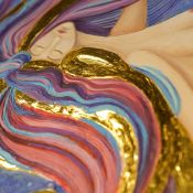 Grace à ce parcours, je lie la peinture et la dorure, j’aime jouer avec la douceur de l’or dans certains de mes tableaux, j’aime le surprenant effet de la dorure reflétant les couleurs, créant un mélange symbolique qui donne à l’ensemble une signature particulière.